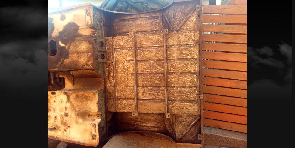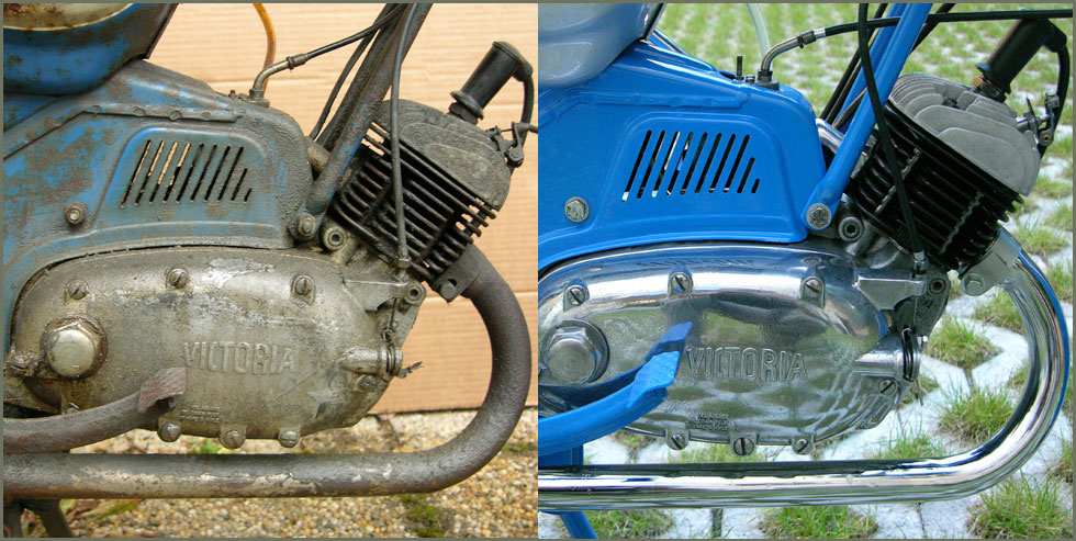 • A teljes szétbontás után az összes alkatrész alapos tisztításon esett át.A szerkezeti elemekről (váz,tank,kerekek)homokfújással lett a régi festékréteg eltávolítva.