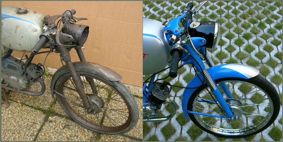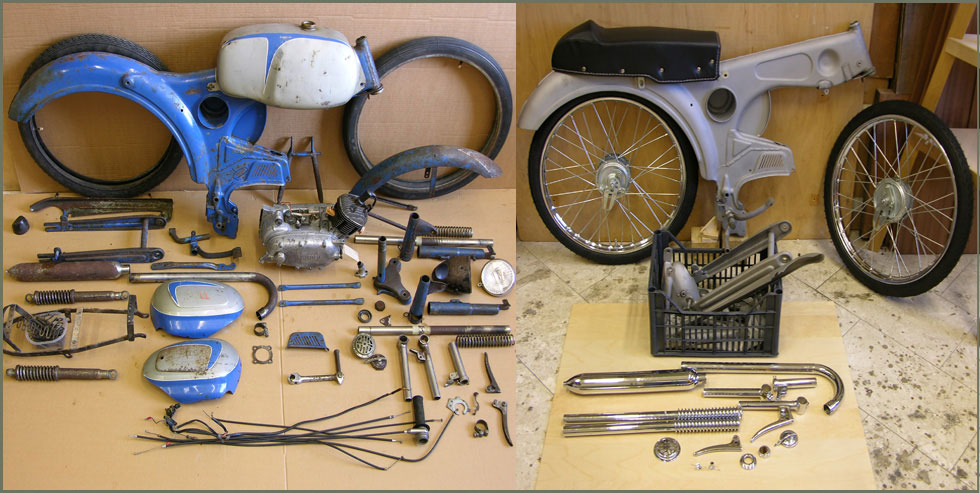 • Homokfújással megtisztított alkatrészek felsorakoztak az új fényezéshez.A tank piros fekete, a váz alkatrészei feketék,a kerekek arany színűek lesznek.